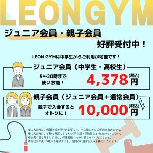 こんにちは、LEON GYMです! 会員プラン、「ジュニア会員」と「親子会員」についてご紹介させていただきます。 ジュニア会員 会員プランであるジュニア会員は、中高生を対象とした通常会員よりもお得な価格で利用できるプラン […]